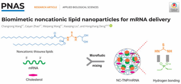 mRNA作为携带负电荷的亲水性大分子,需借助载体穿越细胞膜的静电屏障并抵御RNA酶的快速降解。传统LNP依赖阳离子脂质与mRNA的静电结合,虽能实现封装,却因电荷相互作用引发炎症反应和细胞毒性,且存在靶向性差、体内表达周期短等缺陷。邓宏章团队另辟蹊径,通过人工智能筛选出硫脲基团作为关键功能单元,构建基于氢键作用的非离子递送系统(TNP)。