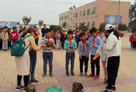同时,学院科协的五位同学为孩子们带来了光立方、无人机等科技作品,现场讲解了工作原理,同时还带领孩子们一起体验“无线电测向”游戏。各年级的孩子们把“大学生哥哥”团团围住,观看作品演示,聆听科普讲解,并在哥哥们的指导下分组体验了无线电测向。一个多小时的课外活动时间里,操场上始终充斥着阵阵惊叹声和欢呼声。