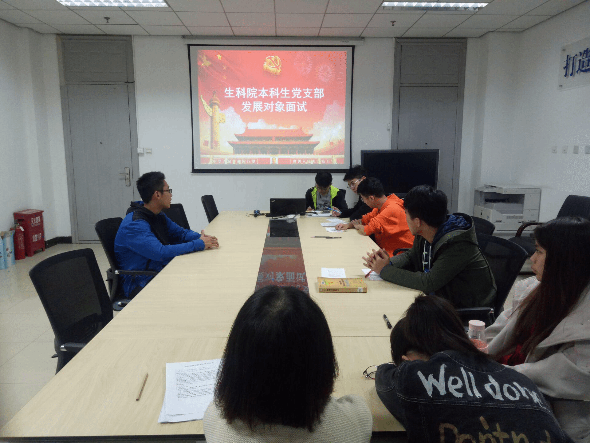 (通讯员 田学斌)2018年10月18日下午,beat365官方网站本科生党支部在G418会议室举行发展对象面试推荐会,本科生党支部全体在校正式党员参加评审,支部书记高鹏主持。