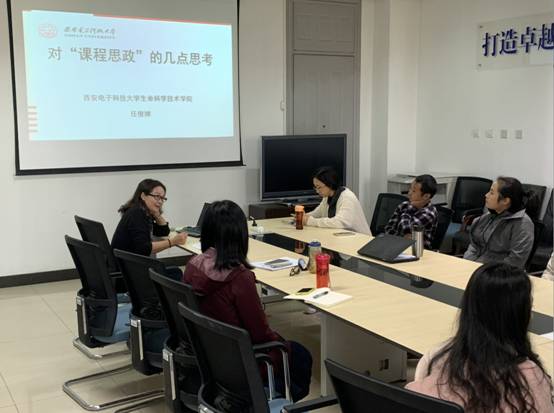 之后,在校级教师大练兵活动中荣获三等奖的任俊婵副教授就专业课中思政元素的挖掘为主题与在座教师进行探讨。她首先向大家介绍了“课程思政”提出的背景,强调“课程思政”与“思政课程”同向通行,形成协同效应,构建全员、全课程育人的“大思政”格局的必要性和重要性。接着任老师深入分析了“课程思政”的含义与价值。最后,任老师从提升教师育德能力和育德意识、明确课程思政在专业课教学中的地位、建立“课程思政”激励机制及制度保障这三点谈了自己对“课程思政”的思考,同时,她向参会老师介绍了自己在课堂教学中实施“课程思政”的一些经验体会。报告完毕,所有参会老师就专业课课堂教学中如何进行思政教育展开了热烈的讨论,大家一致表示,从现在做起,把思政理念写进教学大纲,把思政内容写进教学设计,让思政教育贯穿整个教学过程,真正形成一个全方位育人的“大思政”格局。