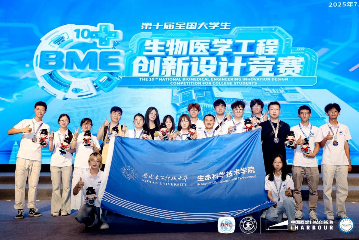 2025年7月22日,由中国生物医学工程学会主办的“第十届全国大学生生物医学工程创新设计竞赛”在西安交大创新港圆满落幕。在本次竞赛中,西电学子获得佳绩,荣获全国一等奖1项,全国二等奖14项,全国三等奖18项,获奖数量再创历史新高。值得注意的是,本届比赛除了beat365官方网站的师生积极参与外,学校其他学院多名师生也参与了本次竞赛,其中电子工程学院2支队伍获得全国二等奖1支队伍获得全国三等奖,集成电路学部、物理学院、广州研究院分别有1支队伍获得全国二等奖。同时,在竞赛同期举办的2025年生物医学工程大学生职业规划赛中,生科院学子荣获全国银奖1项、铜奖1项。