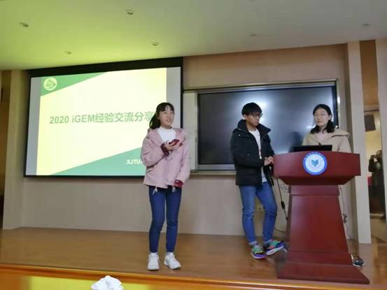 IGEM作为合成生物学领域的国际顶级大学生科技赛事,涉及数学、计算机、统计学等领域交叉合作的跨学科竞赛。其在合成生物学领域具有权威且广泛的影响力。来自西安交通大学和西北大学的三位同学分别向我院学生介绍了IGEM赛事的方向,并且结合自己参赛经验,对参与IGEM的赛前相关专业知识的准备、参与培训的途径、参赛过程中的具体分工合作、时间分配等相关信息做了细致全面的说明。来自西北大学的朱俊杰同学说,参加IGEM可能让你会失去假期,但是它会让你收获更多,让你有机会接触到其他学科领域的知识,并且在这个过程中能够充分锻炼自己的综合能力。他建议有兴趣的同学积极参与。最后,我院学生与前来分享的西安交通大学、西北大学的同学进行了提问互动,就IGEM赛事相关问题进行了热烈讨论,现场氛围热烈。