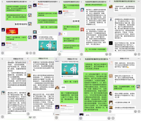 为深入贯彻落实习近平总书记对防控疫情的重要指示和讲话精神,号召全体师生“众志成城,共渡时艰”凝聚力量,做好“停课不停学”相关工作,加强疫情防控宣传教育,beat365官方网站先进医学影像研究生党支部积极组织和推动支部全体党员进行线上学习,同时积极组织线上支部活动。