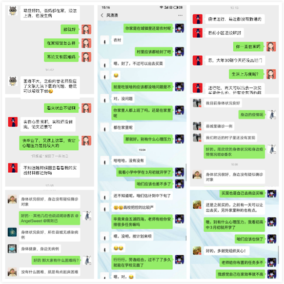 党支部根据学院党委相关疫情安排召开支委会,线上调查询问团队支部所有学生所在地等信息,对身处湖北以及河南等疫情重灾区的学生及时询问学生心理以及身体等状况,对于生活学习困难学生实施系列帮扶,资源共享;“停课不停学”,及时调查学生网络等情况是否满足学习、科研工作需求,对有困难的学生提供流量等支持,在有限条件下,确保学生能够正常开展学习科研相关工作。