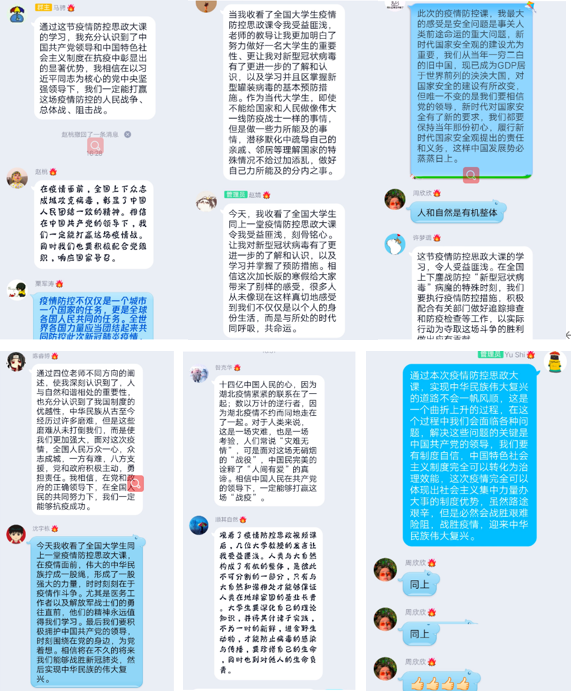党支部全体党员,积极分子及课题组其他学生观看了人民网直播的疫情防控思政大课。思政大课结束后,支部内全体成员进行讨论,讨论会上大家踊跃发言,气氛热烈,对疫情防控中体现的制度优越性和人与自然的关系等有了深刻的认识。