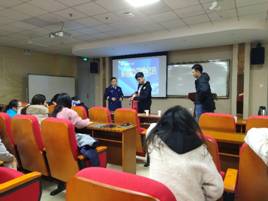房小锋首先播放了消防主题视频,然后从自己的大学经历与工作内容谈起,拉开了本次讲座的序幕。房队长通过两例由于工作人员不知道及时灭火、不懂得使用灭火器而引起的重大消防事故告诉同学们具备消防意识、掌握消防知识的重要性。