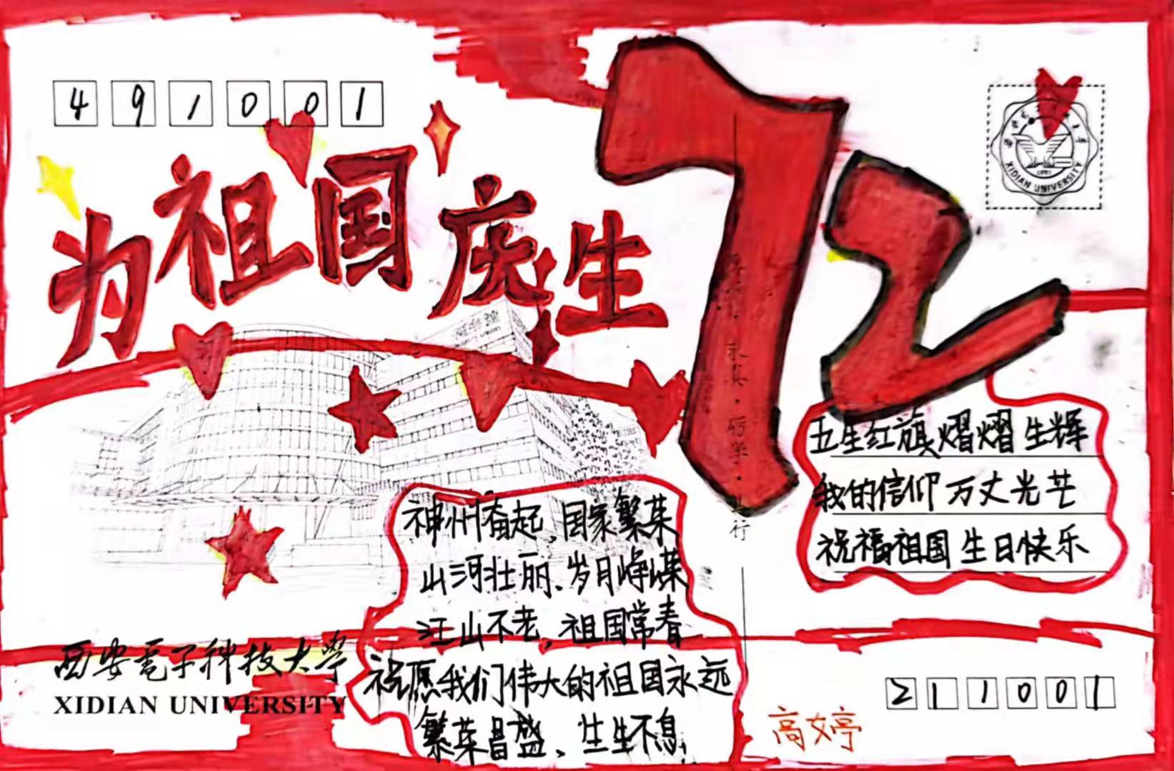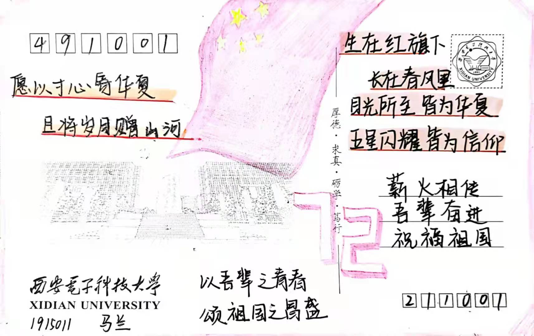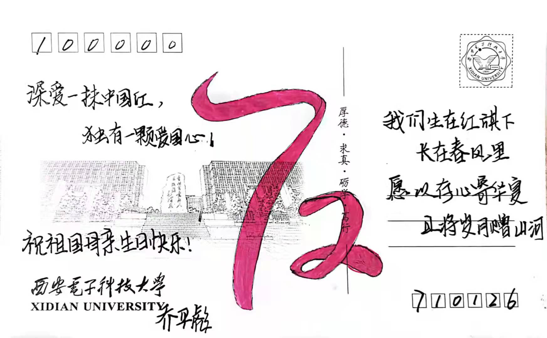在与国旗合影之余,同学们在带有西电地标性建筑的明信片上写下了对祖国的美好祝愿,向祖国深情告白。