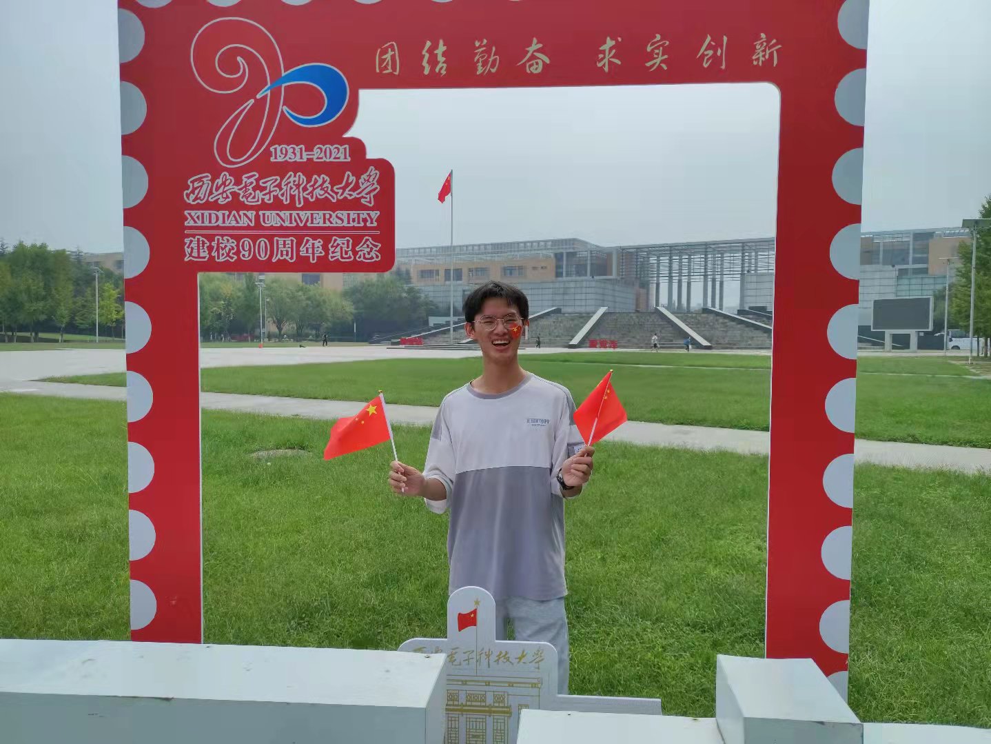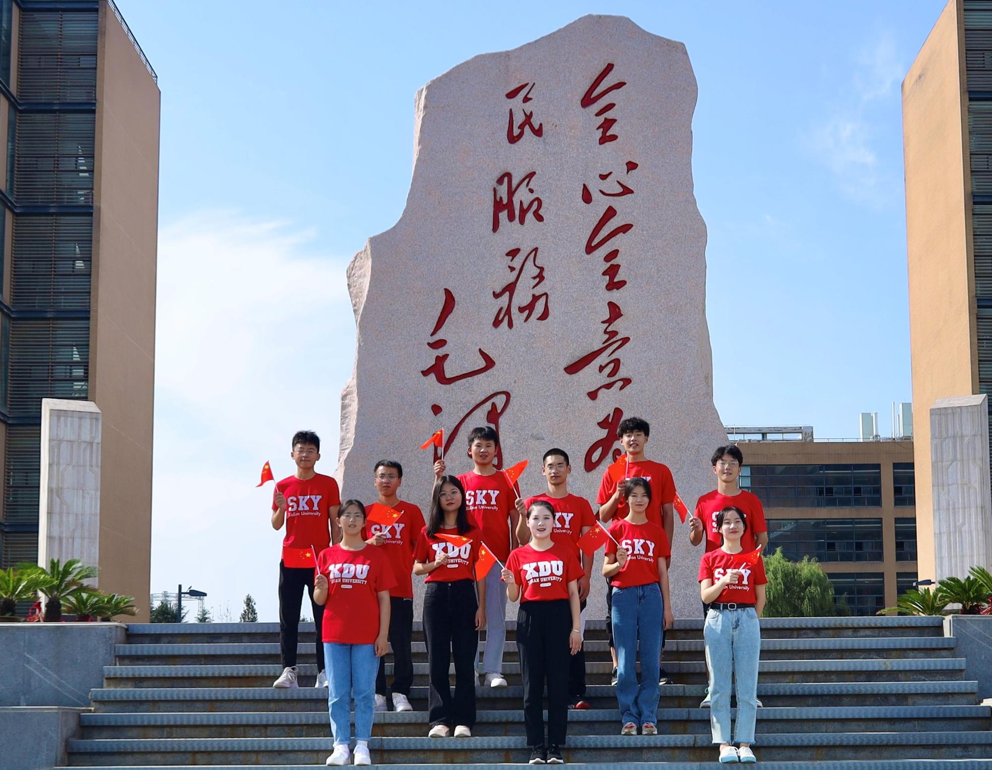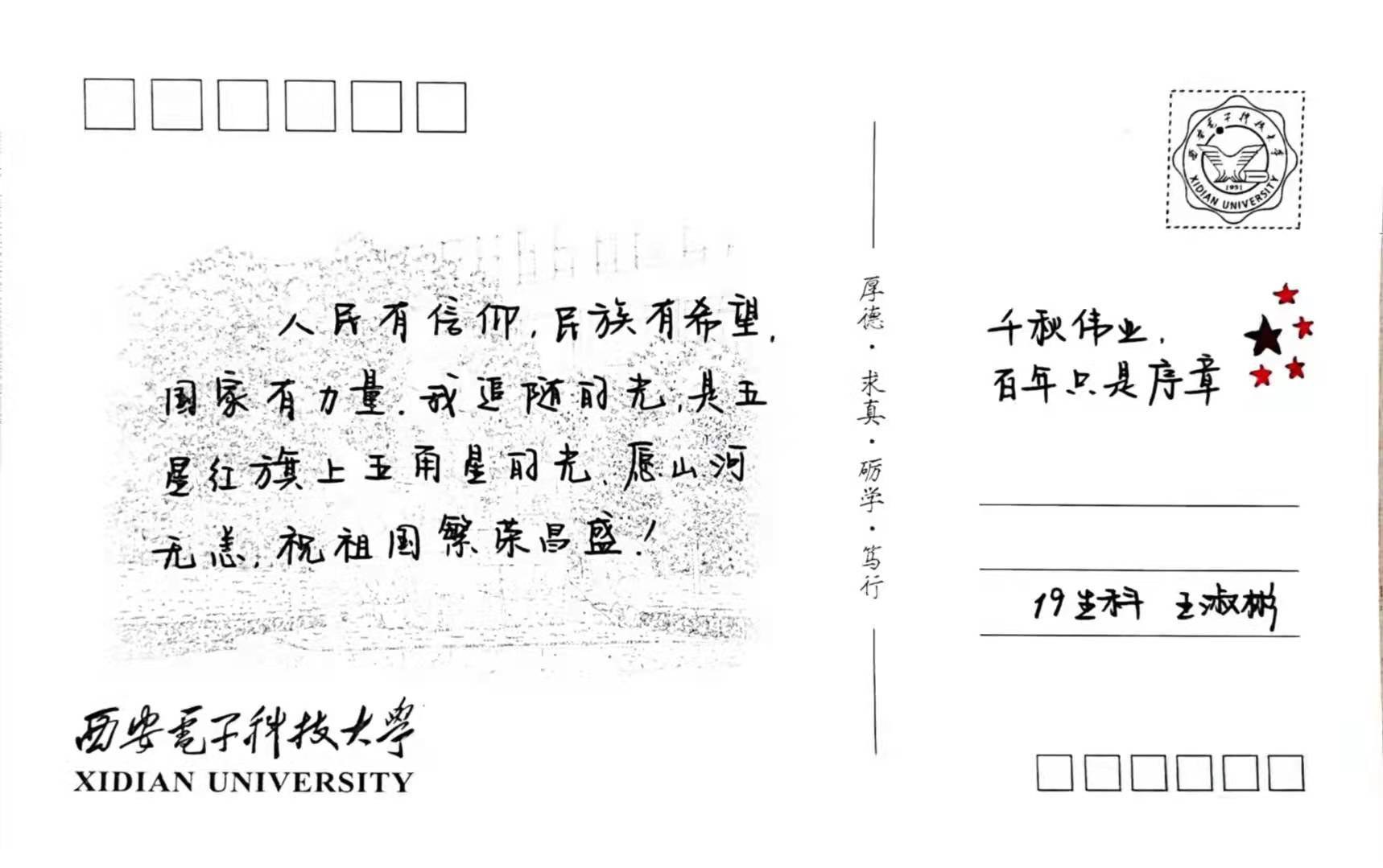 在与国旗合影之余,同学们在带有西电地标性建筑的明信片上写下了对祖国的美好祝愿,向祖国深情告白。