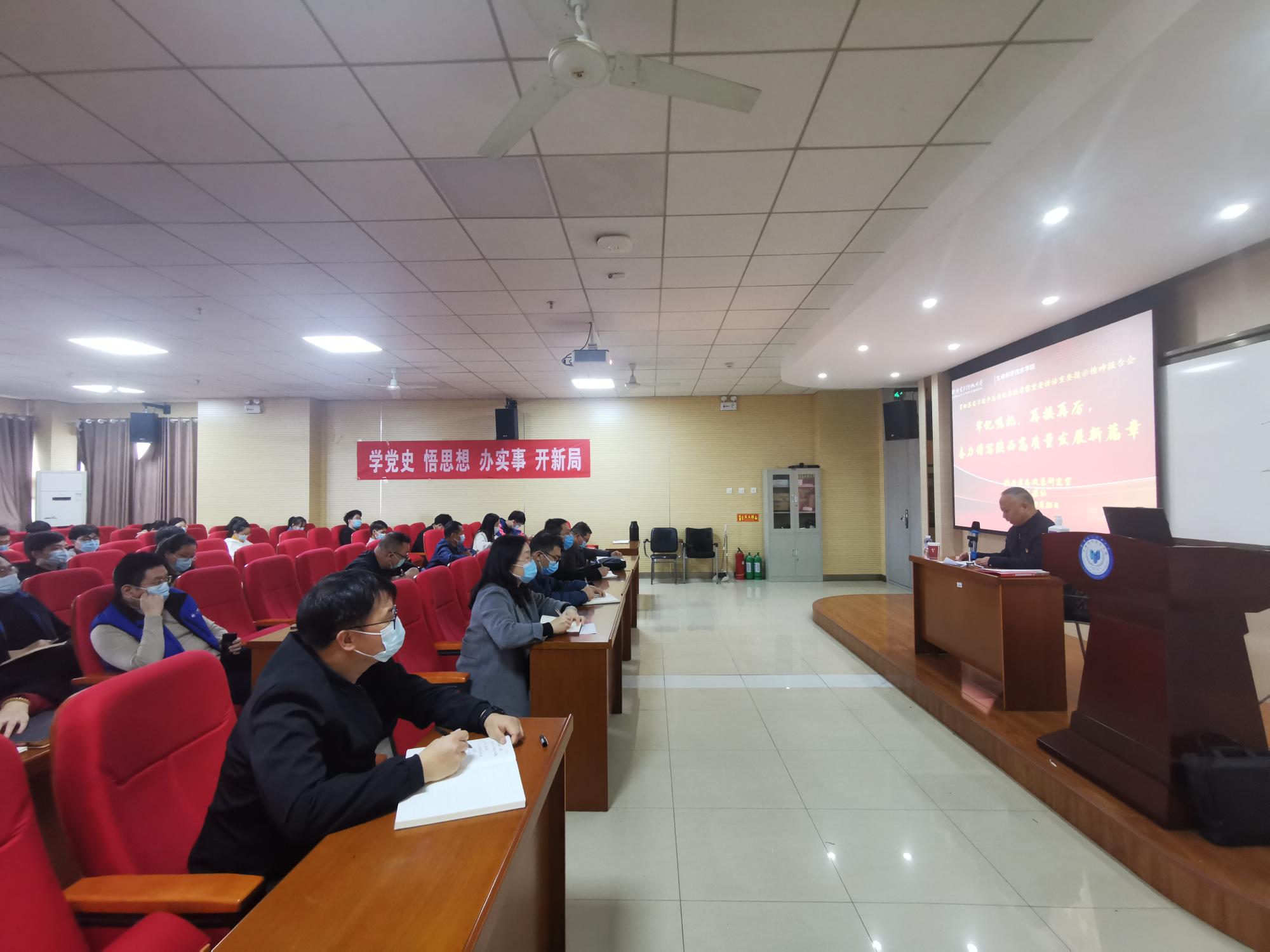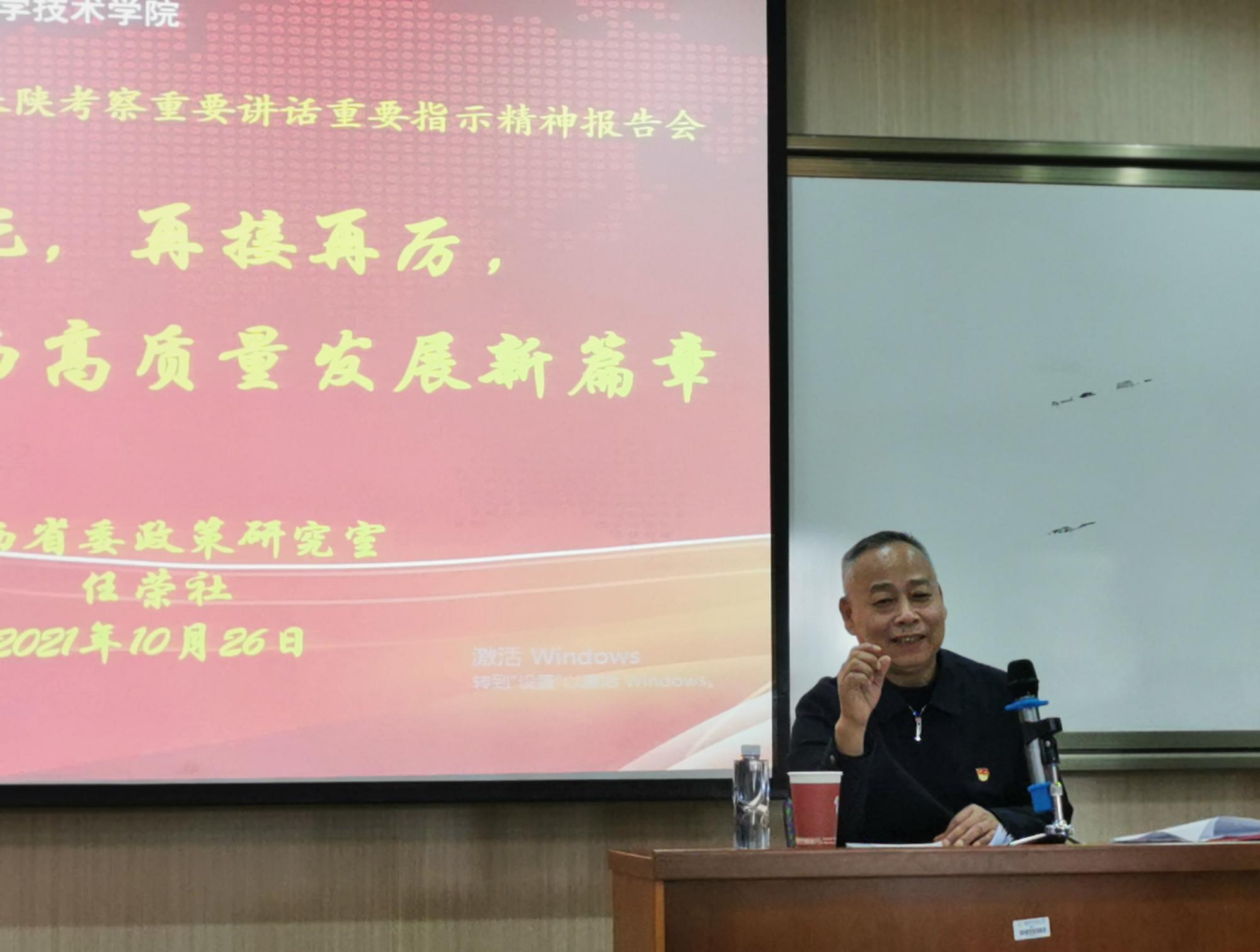 为深入推进党史学习教育,贯彻落实习近平总书记来陕考察重要讲话重要指示精神,生科院于10月26日举办“牢记嘱托,再接再厉,奋力谱写陕西高质量发展新篇章”专题报告会。报告邀请陕西省委政策研究室副厅级研究员、陕西省委贯彻落实习近平总书记来陕考察重要讲话重要指示精神宣讲团主要成员任荣社主讲。学院领导班子、两委委员、党支部书记支委及师生党员代表近60人参加了此次报告会。报告由党委书记王丽玲主持。