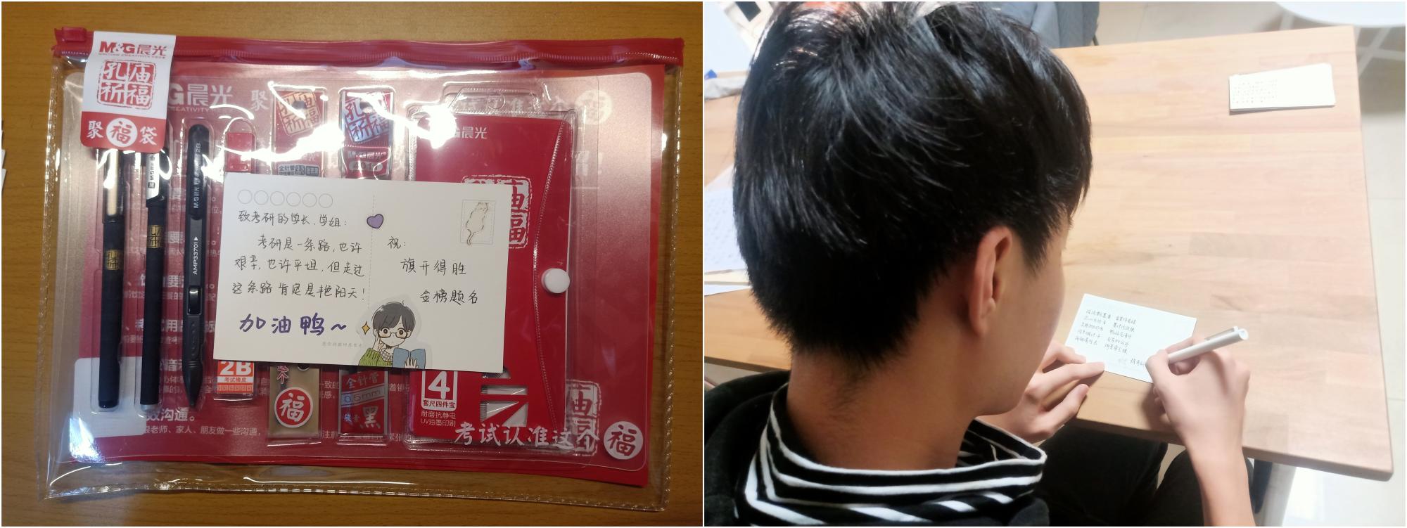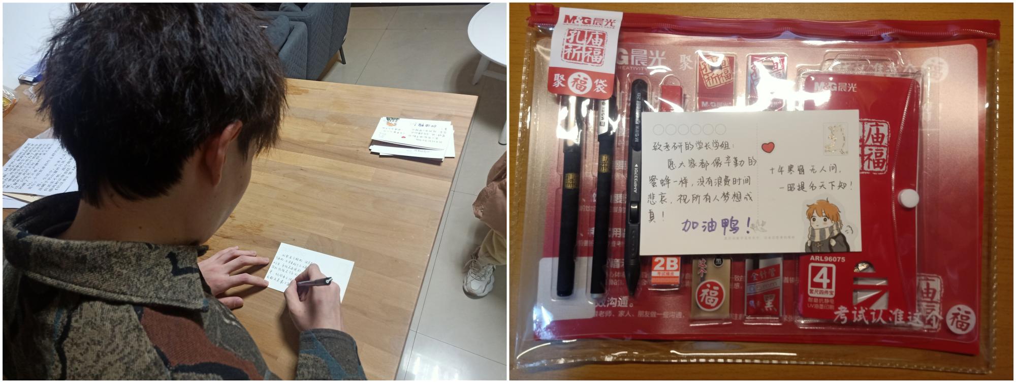 学院为每位考研学子精心准备了暖心大礼包,含有文具礼袋、牛奶、耳塞、暖宝宝、抽纸以及学弟学妹们的手写祝福贺卡。文具礼袋寓意金榜题名;暖宝宝驱走了冬日的寒冷;贺卡承载着全院师生对考研学子最真挚的期许与祝福。学院老师和学弟学妹的祝福如同冬日里跃动的火苗,温暖着考研学子的心,不仅承载了大家对考研学子成功上岸的美好祝愿,更为每一位考研学子提供了又一份精神上的支持。