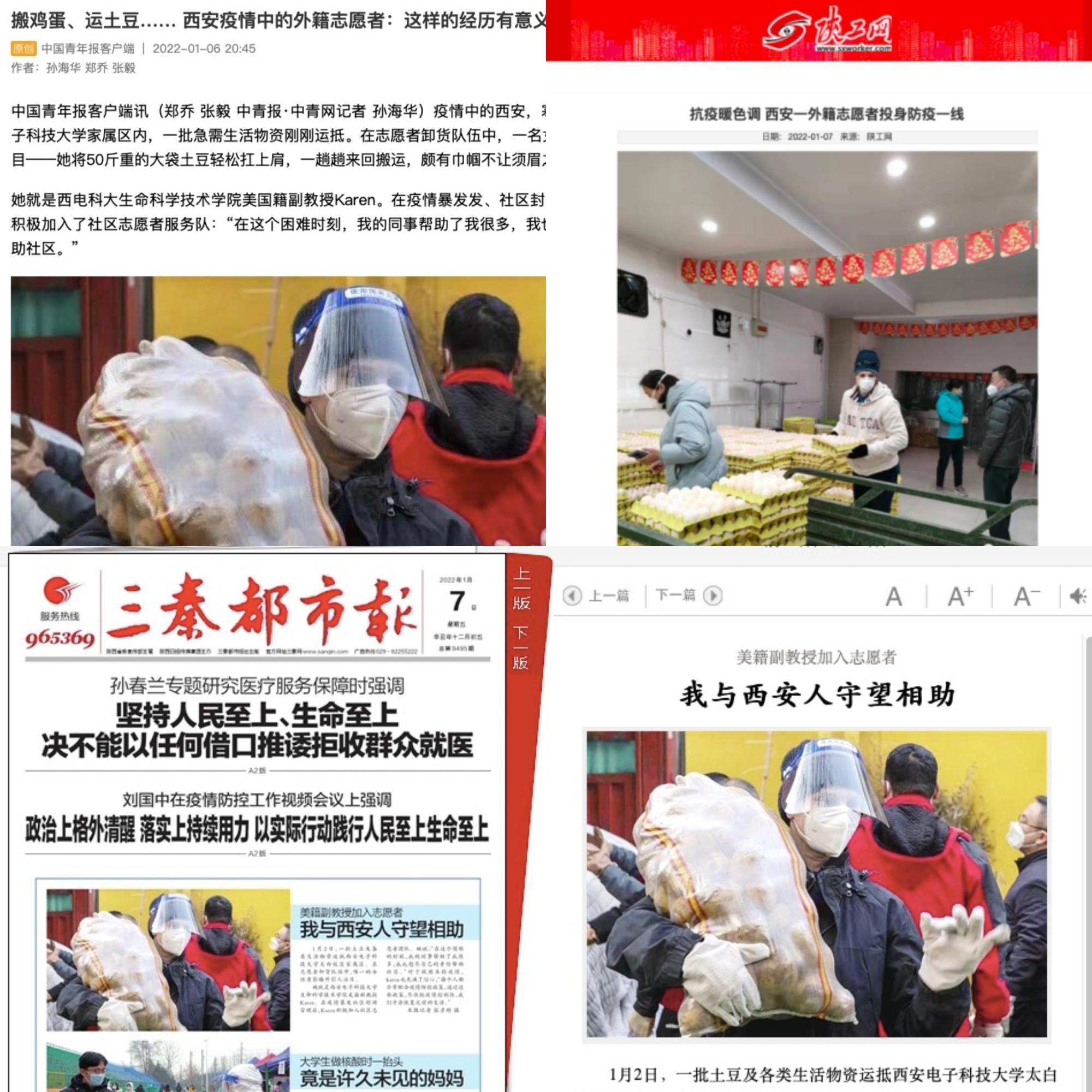 “在这个困难的时刻,我的同事帮助了我很多,我也想尽自己的责任帮助社区。”外籍副教授Karen在学院同事的带动影响下,积极参与志愿服务,完成了搬运鸡蛋、土豆等物资配送工作,其相关事迹受到了新华社、中国青年报、三秦都市报、陕工网等媒体的报道。