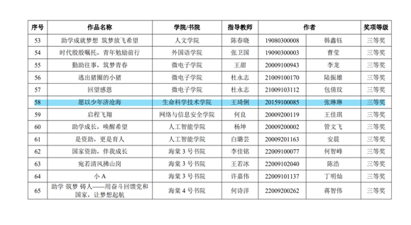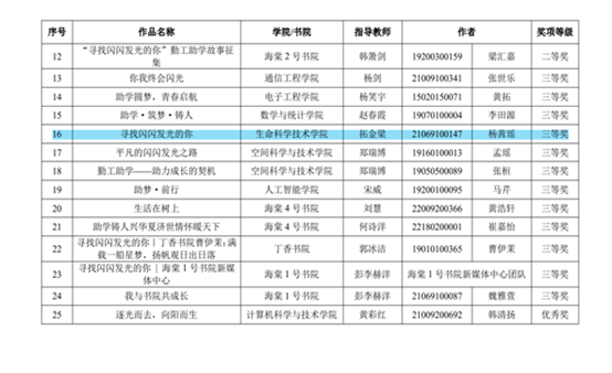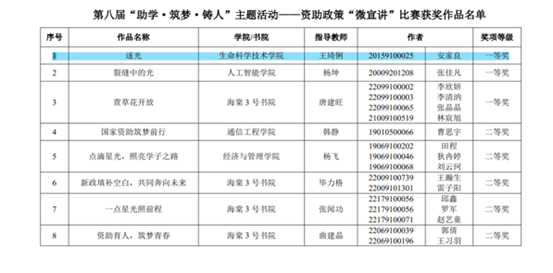 资助政策“微宣讲”比赛中,2020级安家良同学的《逐光》荣获一等奖;“助学圆梦,青春启航”主题征文比赛中,2020级张琳琳同学的《愿以少年济沧海》荣获三等奖;“寻找闪闪发光的你”勤助故事比赛中学院勤工助学岗位杨茜瑶同学团队荣获三等奖。此外,王琦俐老师荣获活动优秀指导教师的称号。