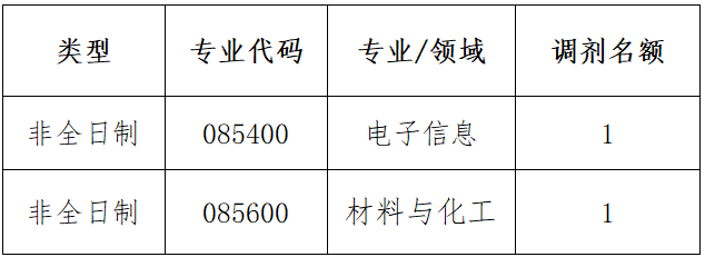 我院电子信息专业(085400)、材料与化工专业(085600)现有少量非全日制指标,招收校内调剂考生,相关事宜通知如下: