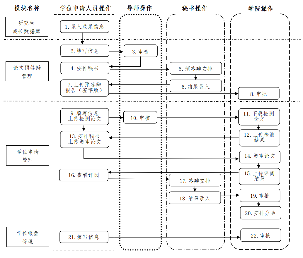 申请学位通过研究生管理系统进行,学位申请人员、导师、学院管理员及答辩秘书登录:beat365官方网站研究生院主页“研究生管理系统”,操作流程如下图所示: