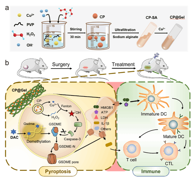 近年来,一些联合治疗策略以及免疫治疗确实为预防乳腺癌术后复发带来了新的曙光。然而,由于肿瘤细胞的凋亡抵抗和多重免疫抑制,仍然难以取得理想的治疗效果。因此,引入一种具有高免疫原性的新型细胞死亡模式是非常必要的。细胞焦亡是一种新定义的促炎性和免疫原性细胞死亡,通常情况下需要半胱氨酸天冬氨酸蛋白酶(Caspase)切割焦亡执行蛋白Gasdermin形成跨膜孔洞,其特征是细胞肿胀、膜穿孔,然后快速释放肿瘤相关抗原、损伤相关分子模式以及免疫激活细胞因子,不仅可以调节免疫抑制,还可以提高免疫原性。现有的研究显示出细胞焦亡在抗肿瘤治疗方面的潜力,然而,其在预防乳腺后术后复发方面的确切作用还有待研究。此外,在术后治疗领域,药物递送方式很关键,其可以显著影响治疗效果和安全性,而可注射水凝胶是一种独特的载体,具有优异的生物相容性、持续的药物释放和良好的术后部位覆盖率,使其成为术后治疗的理想剂型。