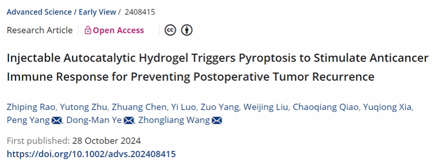 Rao Z, Zhu Y, Chen Z, Luo Y, Yang Z, Liu W, Qiao C, Xia Y, Yang P, Ye DM, Wang Z. Injectable Autocatalytic Hydrogel Triggers Pyroptosis to Stimulate Anticancer Immune Response for Preventing Postoperative Tumor Recurrence. Adv Sci (Weinh). 2024 Oct 28:e2408415. doi: 10.1002/advs.202408415. Epub ahead of print. PMID: 39465669.