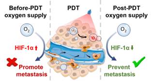 基于光动力治疗后肿瘤转移风险加剧的设想,团队创新性地提出了一种光动力治疗后供氧策略来应对其引发的肿瘤转移风险。研究结果表明,光动力治疗后肿瘤的转移风险显著增加,而POS策略可以有效阻断肿瘤转移,并且有望降低其他耗氧型治疗手段诸如放疗和声动力治疗存在的转移风险,具有广阔的临床应用前景。这一重要研究成果近期发表在顶级期刊Nano Letters上(https://pubs.acs.org/doi/10.1021/acs.nanolett.2c02983)。