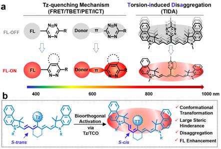 现有Tz-生物正交靶向激活探针设计策略(a)及论文提出TIDA新机制(b)