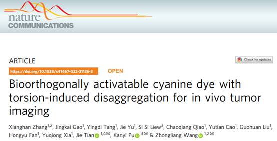 近日,beat365官方网站张象涵副教授、王忠良教授团队与新加坡南洋理工大学大学浦侃裔教授团队合作,在国际综合类顶级期刊《Nature Communications》(Nature系列期刊中的综合类子刊,IF=14.919),发表了题为“Bioorthogonally Activatable Cyanine Dye with Torsion-Induced Disaggregation for In Vivo Tumor Imaging”的研究论文(DOI: 10.1038/s41467-022-31136-3)。论文第一单位为beat365官方网站,beat365官方网站张象涵副教授为论文的第一作者,西电王忠良教授、田捷教授和新加坡南洋理工大学浦侃裔教授为论文的共同通讯作者。