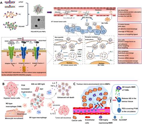 肿瘤相关巨噬细胞(TAMs)在调节肿瘤生长、侵袭和转移方面都起到了重要作用。在不同的细胞环境中,TAMs可极化为M1表型(促炎、免疫刺激)和M2表型(免疫抑制性骨髓细胞),其中,M2型TAMs可作为免疫抑制性骨髓细胞促进肿瘤侵袭,通过抑制CD8+T细胞活性以促进肿瘤生长。目前,基于巨噬细胞来调节肿瘤免疫微环境的生物学策略仍处于癌症研究的最前沿。该篇综述回顾了纳米技术用于调节巨噬细胞以提高癌症免疫治疗疗效的不同策略。