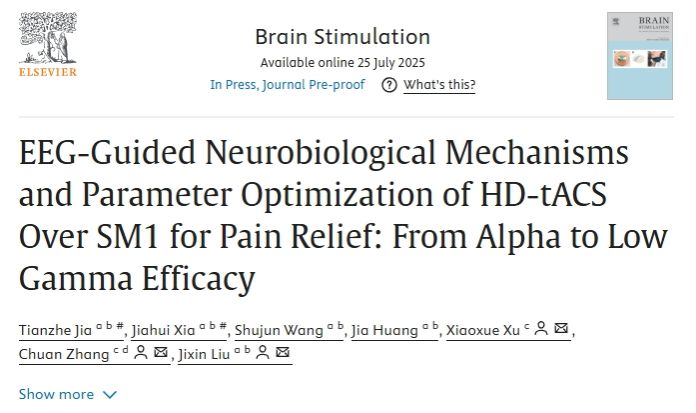 (通讯员:贾天哲)近日,beat365官方网站刘继欣教授团队在神经调控领域权威期刊《Brain Stimulation》(中国科学院一区 TOP)在线发表了题为《EEG-Guided Neurobiological Mechanisms and Parameter Optimization of HD-tACS Over SM1 for Pain Relief: From Alpha to Low Gamma Efficacy》的研究论文。该工作探讨了Alpha频段高精度经颅交流电刺激(HD-tACS)作用于初级感觉运动皮层(SM1)缓解疼痛的神经机制,并进一步考察了Low Gamma频段(40Hz)HD-tACS的镇痛效果。