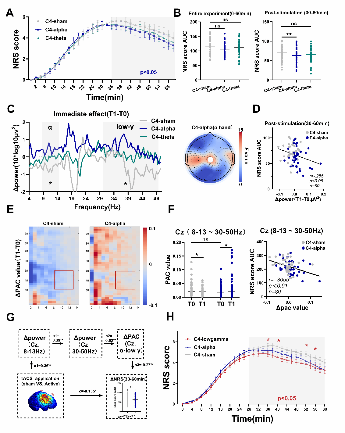 慢性疼痛是全球范围内一个重要的健康问题,影响广泛人群。非侵入性神经调控技术因其安全性受到关注。当前研究使用辣椒素诱导的实验性疼痛模型,发现在SM1区施加10Hz Alpha频率的HD-tACS能产生持续的镇痛效应,这一效果在刺激结束后(特别是30至60分钟)最为明显。进一步的脑电(EEG)分析表明,Alpha频率刺激的镇痛作用不仅与刺激后该区域Alpha节律强度的提升有关,还伴随有低频伽马(Low Gamma, 30-50 Hz)振荡功率的增强,以及Alpha节律与Low Gamma振荡幅度之间相位-幅值耦合的显著加强。中介分析进一步发现Alpha-Low Gamma 振荡幅度之间的耦合减弱与总体疼痛感受的增强密切相关联,提示其在疼痛调控中扮演了重要角色。鉴于Alpha频率刺激效果可能与调控Gamma活动相关,研究团队尝试了直接施加Low Gamma频率(40 Hz)HD-tACS的干预策略。实验中,40 Hz刺激诱导出了镇痛效应,并且与传统的10 Hz Alpha刺激相比,40 Hz刺激显示出更快速的起效倾向,镇痛幅度也更为显著。这一结果支持直接靶向调控Gamma神经振荡可能更有效地干预疼痛信号处理的假设。