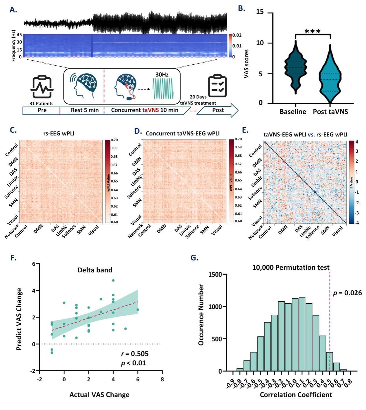 (通讯员:蔡素平)近日,beat365官方网站袁凯教授,蔡素平副教授,联合合作单位西安国际医学中心消化病院赵青川教授和黄钦贤医生在神经调控领域权威期刊《Brain Stimulation》(中国科学院一区 TOP)在线发表了题为《Predictive Value of Acute Neuroplastic Response to taVNS in Treatment Outcome in Persistent Abdominal Pain: A Concurrent taVNS-EEG Trial》的研究论文。该工作探究了30Hz-急性经皮耳迷走神经刺激(taVNS)诱导的大脑功能连接(FC)改变对顽固性腹痛(PAP)患者临床治疗反应的预测价值。