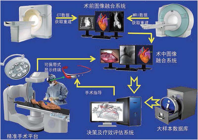 Precision Medicine relies on advent medical imaging technique, fusion of multi-modality medical imaging and information, and large-scale data mining on medical cases. Our research group focuses on challenging problems in surgical navigation in congenital heart disease, such as identifying hearts’ anatomical structure, real-time decision support in surgery and early assessment of surgical effect. We aim to establish an intelligent auxiliary platform for complex congenital heart disease, adopting advanced 2D to 3D image registration algorithms and intelligent vasculopath planning algorithms, our research team has hemodynamic theories and machine learning methods, as well as the facilitation of treatment plan and intraoperative navigation. At present, we have developed a multi-functional 3D image processing and display system. Our research work is supported by joint fund key projects from Natural Science Foundation of China (NSFC).